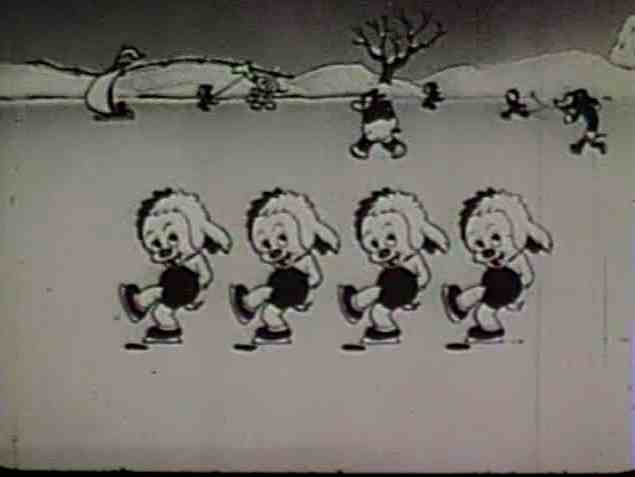 Comments: The print I watched might not actually have a clipped beginning. Opens on an establishing shot of a shoe house. Releasing a cartoon about playing in the snow right after kids have to be back in school after Xmas break: classy. Snowman skeletons are made of puppies. A fussy giraffe with a pipe, a piano, a tuba, a hippo; these are all things I wouldn't want to be on the ice with, but there they are. Still showing the words "honk honk honk" on screen at this late date? Ice floes look like the playfield in Frogger. Having a litter of pups each doing the same thing in succession saves on animation.